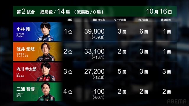 余談ではあるが、内川と同時に「ロン」と声を上げた堂岐は背中がつってしまうハプニングが。東2局がはじまるやいなや、「小休止ボタン」を押し、東2局を耐え凌いだという。なんとも愛おしいエピソードである。大事に至らなくて良かった。