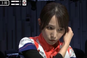 本田のみ連闘となった第2試合。開局、その本田が先制打を放つ。南家の本田が15巡目にピンフ・ドラ1のリーチをかけると、たて続けに沢崎と魚谷がリーチを宣言。しかし、魚谷の宣言牌が本田に一発命中。8000点で本田がリードを奪う。