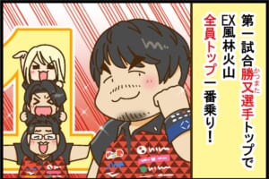 だが、その後は他者の大きなアガリが続き、園田は放銃こそないものの、3番手に後退して南場を迎えることになる。さらに、南1局には親の高宮がリーチツモピンフ三色ドラ裏の6000オールを決め、大きく抜け出されてしまう。