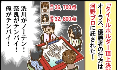 麻雀最強戦2022 タイトルホルダー頂上決戦、 優勝の行方は、なんと 河野高志選手の テンパイ・ノーテンに よって決せられる事態に!! 河野選手の胸中や…!? 【Mリーグほぼ毎日4コマ】 2022年6月25日 作・藤島じ … 続きを読む 【麻雀最強戦2022 タイトルホルダー頂上決戦】優勝の行方は、なんと河野高志選手のテンパイ・ノーテン宣言によって決せられる事態に!! 河野選手の胸中や…!?【Mリーグほぼ毎日4コマ】藤島じゅん/VOL.310
