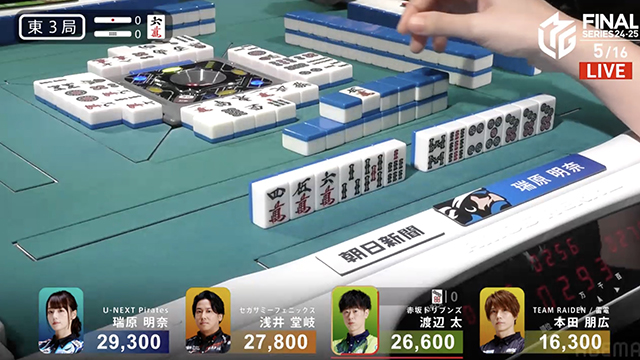 最終巡目にツモ番なしリーチを敢行するも、結果は流局。この後、瑞原にはアガリが生まれず、この試合を3着で終えることとなった。