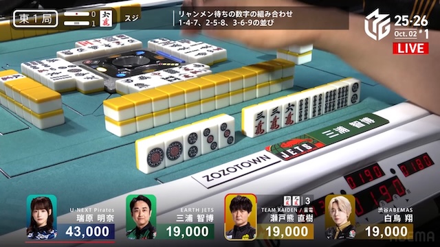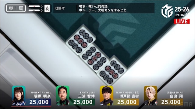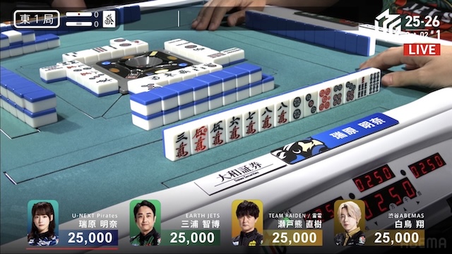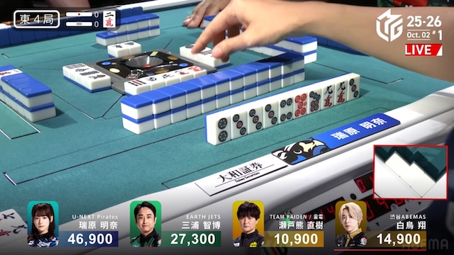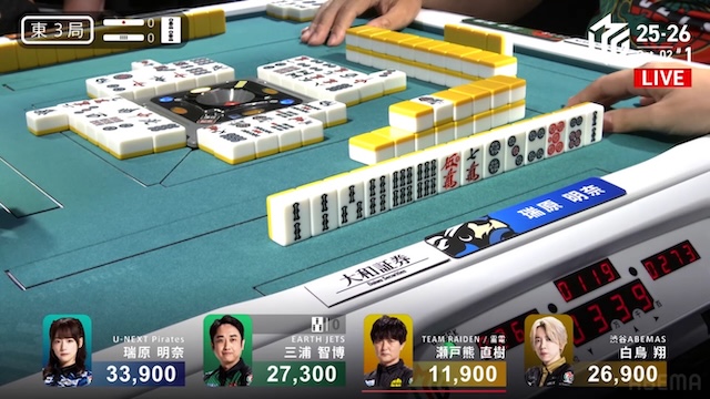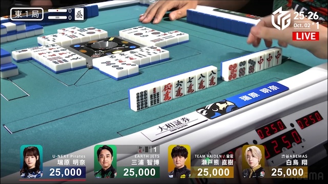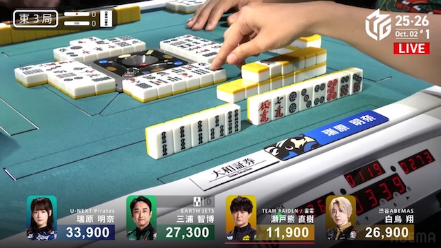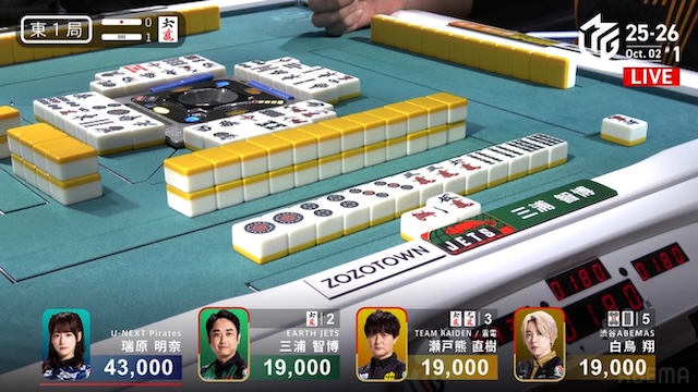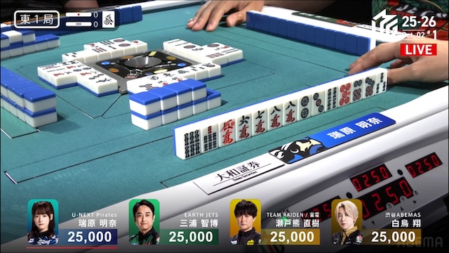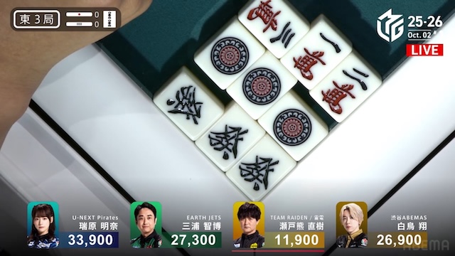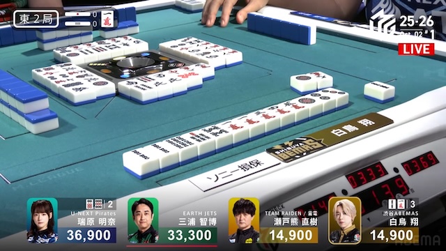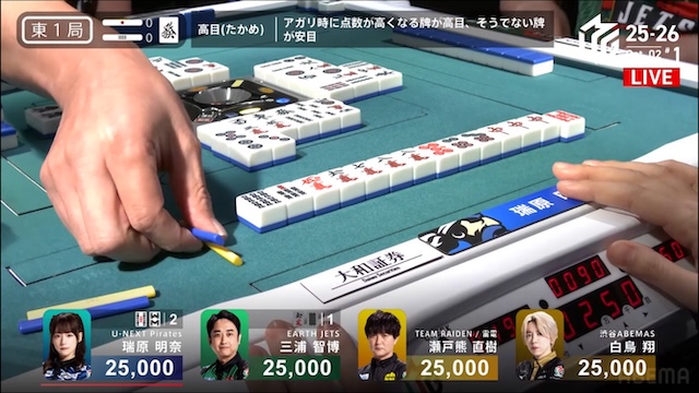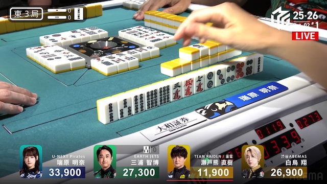 誰が勝ち取るのか、息を呑む緊張感に包まれる中、決着はあっという間に訪れる。三浦がを一発でツモアガリ。リーチ・一発・ツモ・チートイツ・ドラ2、3000-6000は3100-6100。ドラ単騎での果敢な選択が、最高の結果を呼び込んだ。新チームEARTH JETSの闘志を象徴するかのような鮮烈な一撃だった。