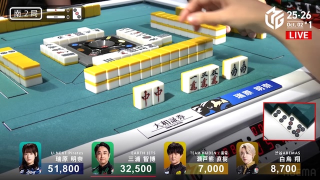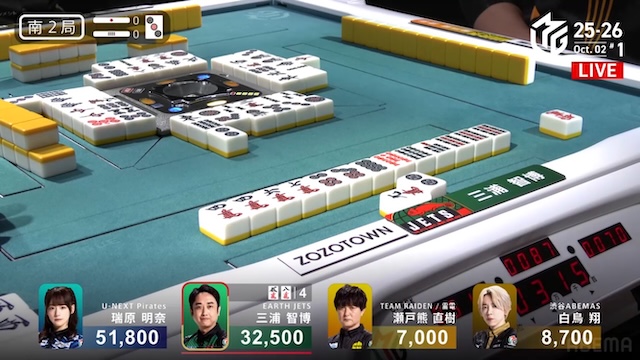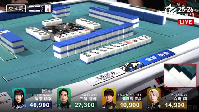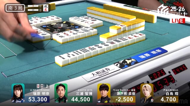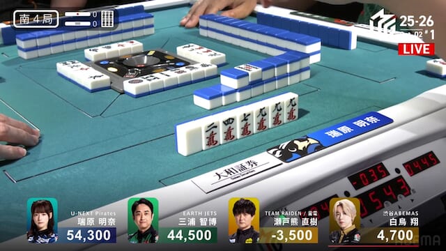 大きな打点が飛び交った東場の中で、最後は堅実に加点を重ねて締めくくった。瑞原の落ち着きが光る一局となり、南場へと移る。