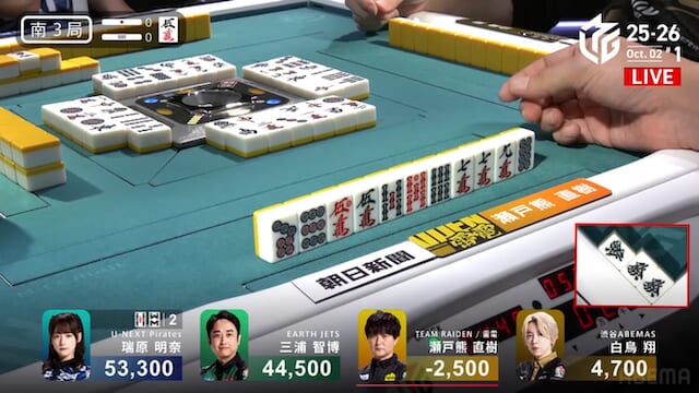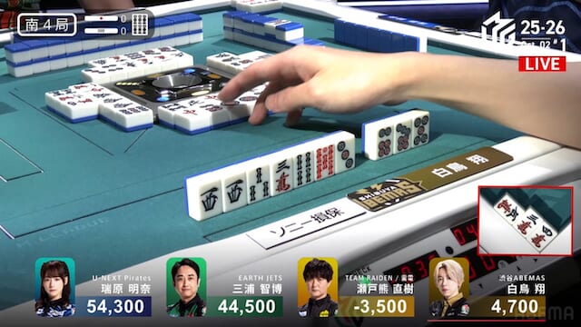 その瑞原の圧を前に、親番の白鳥はテンパイを取るはずのを切れず、苦渋のテンパイ外しを選択。