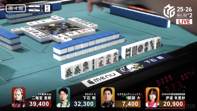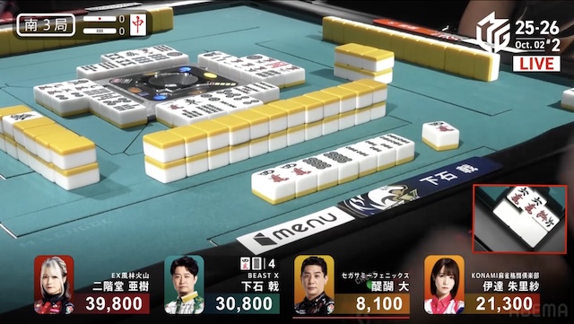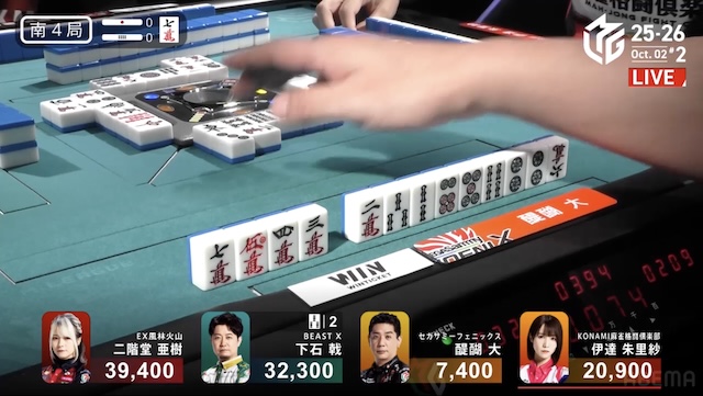 こうなったら、テンパイしていない亜樹は見の構え。下石への直撃はもちろん、醍醐への満貫放銃でも着落ちしてしまうため、2人に当たらない牌を慎重に選んでいく。