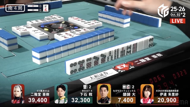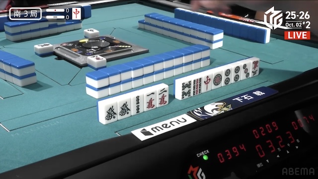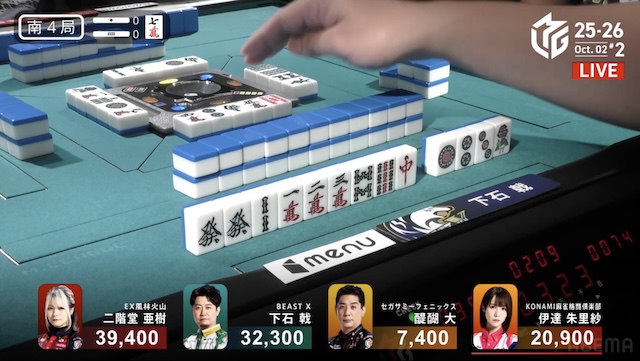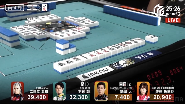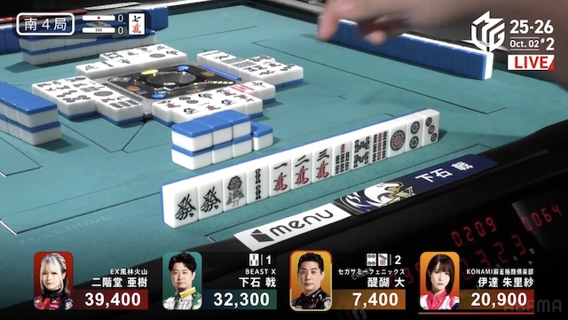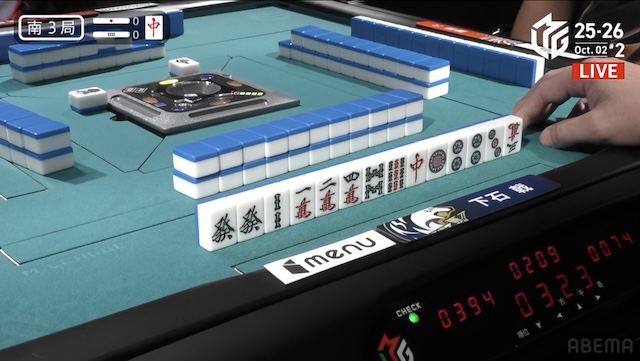 下石の待ちは決してよくはない。そして、そこに醍醐のリーチが飛んできた。醍醐はラス抜けまでハネ満ツモ条件だが、出アガリ満貫からのリーチは、まだシーズンの序盤ということもあり、見逃してまでの着アップは狙わないだろう。最後の最後に、熱いめくり合いだ。