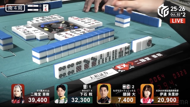 南2局には亜樹の満貫ツモで突き放されるものの、南3局にはのみのシャンポン待ちをツモってテンパネの400-700。満貫出アガリ条件を残してオーラスを迎えた。