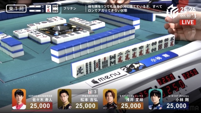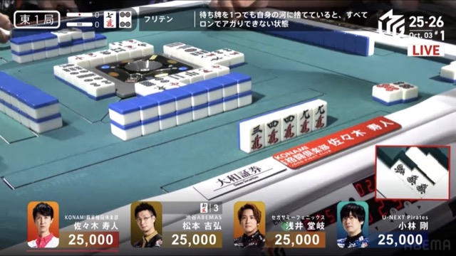 松本は長考の末、ドラのを切り出して放銃を回避してヤミテン続行。