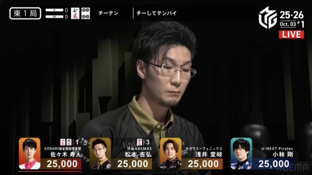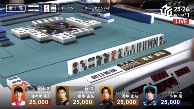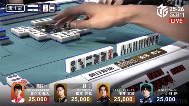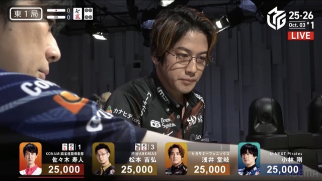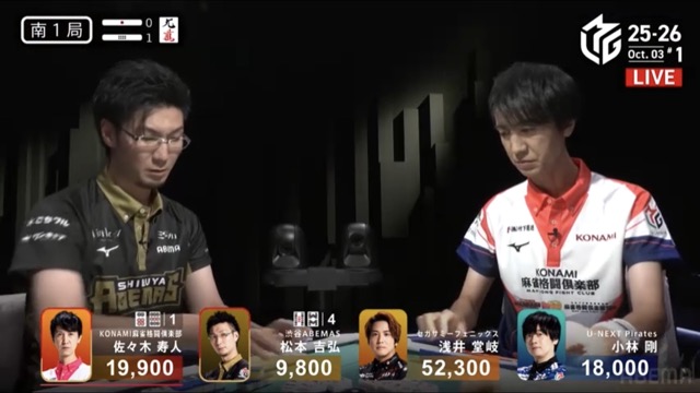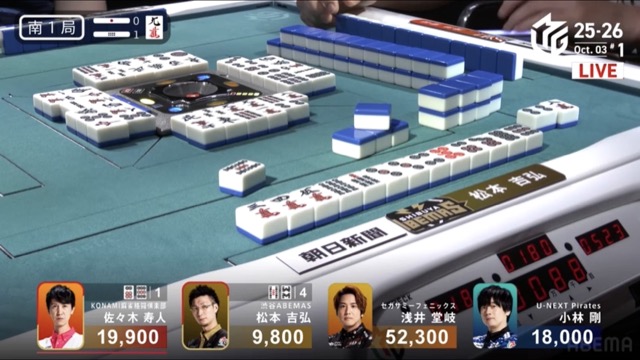 今度は松本が南1局1本場に寿人からリーチピンフ赤ドラの8,000でやり返し。