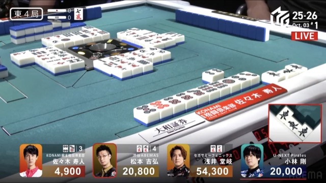 東4局に寿人がホンイツ赤の8,000を松本からアガると、