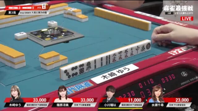 前局では木崎が跳満でアガり、33000点と篠原に並びトップとなった。