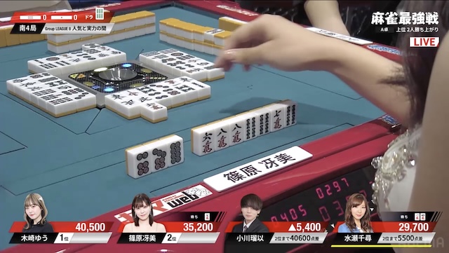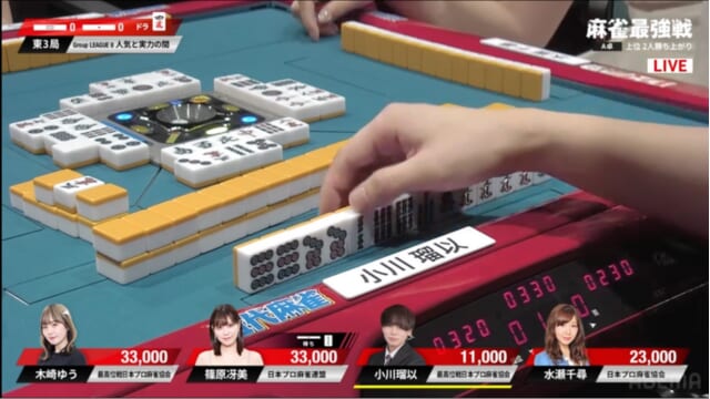 厳しい配牌からテンパイまでこぎつけた小川だったが、篠原に放銃してしまった。