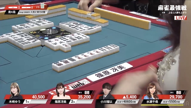 リーチ、ドラ、裏ドラの3翻、5200点が加算され、篠原が再びトップに躍り出た。
