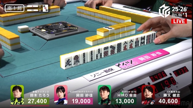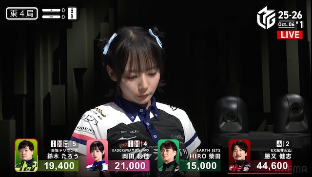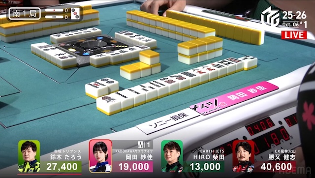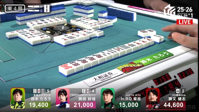 東3局でもたろうとのリーチ対決を制して2600のアガリを手にして、大きなリードを奪った。