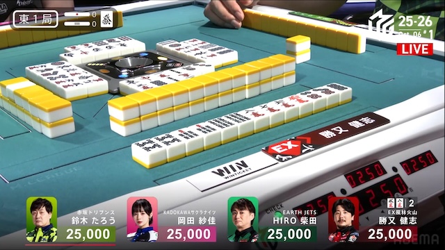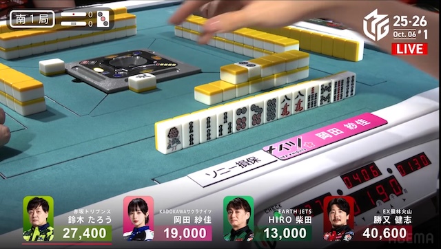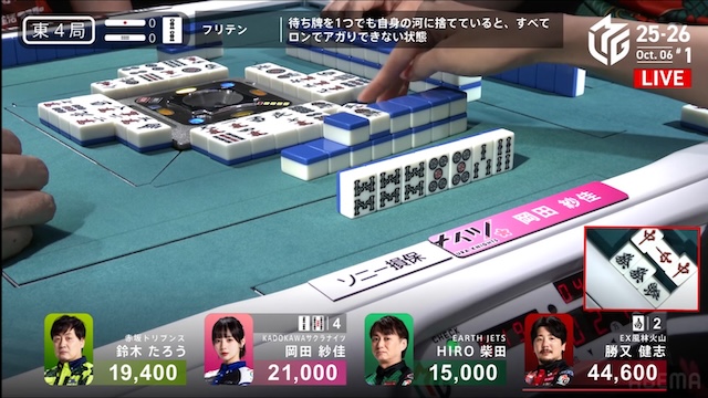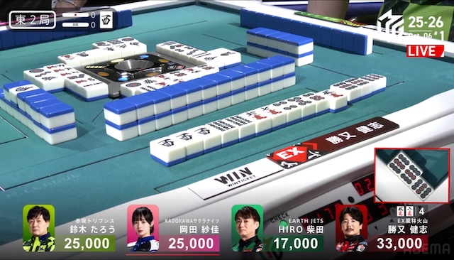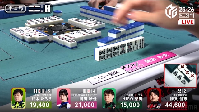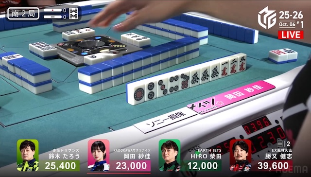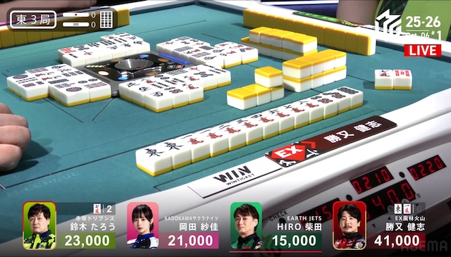 反撃に出たい岡田はダブをポンしている勝又のテンパイをかいくぐって