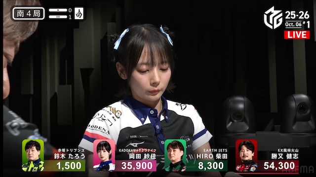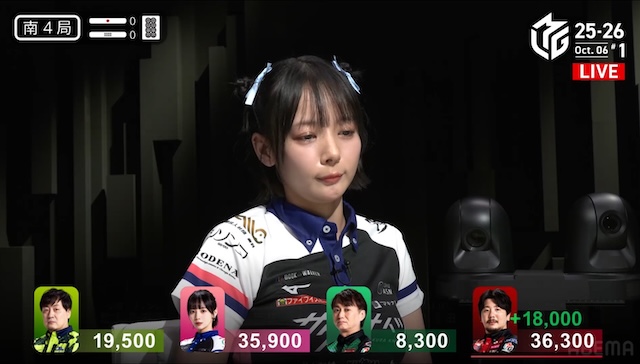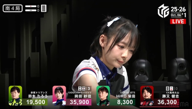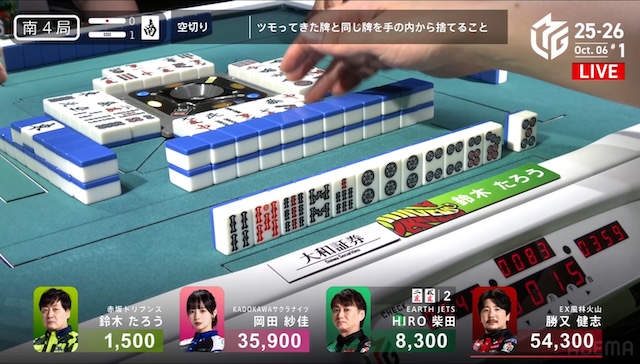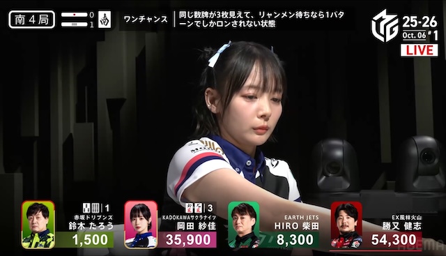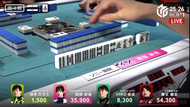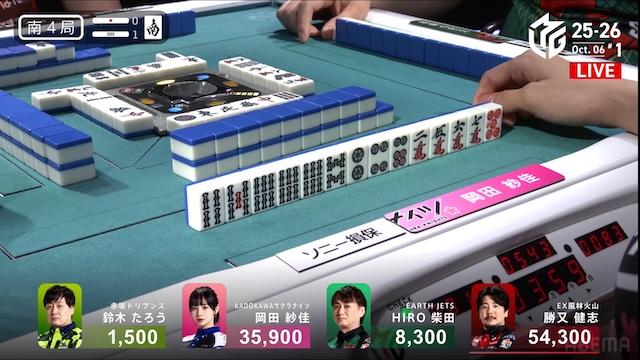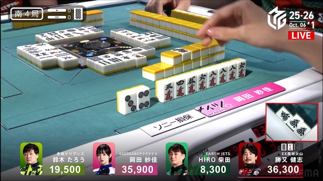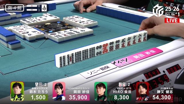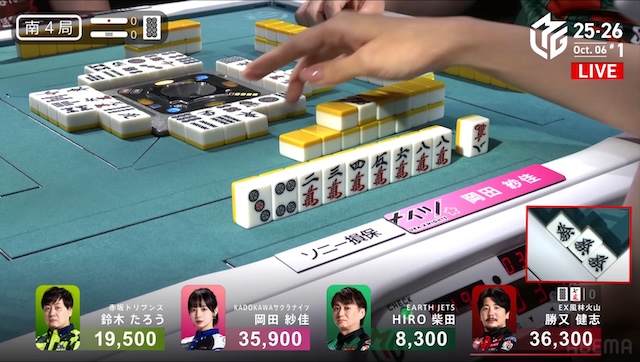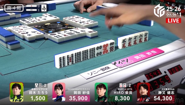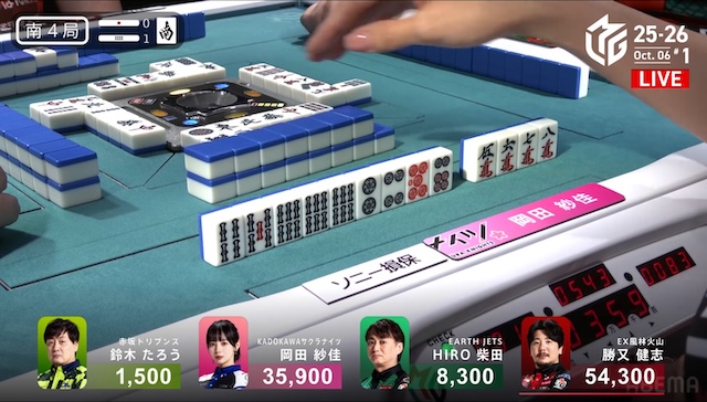 これにより、場にリーチ棒が出た。岡田はこれで、跳満ツモは文句ナシの単独トップ。