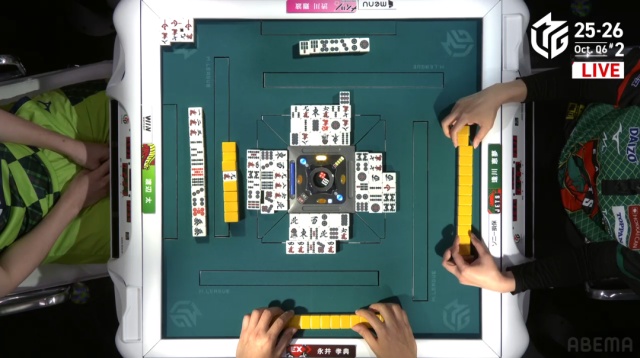 ドラと赤を使うカンの仕掛けをして、手の内は4cmバラバラ数牌。自身の打点と逢川の親を自由にやらせないことに全身全霊。