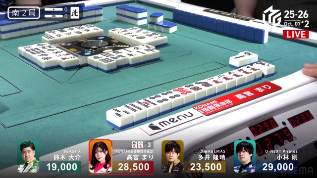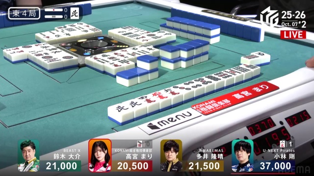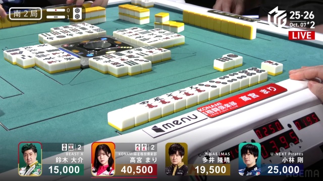 この日の高宮はよく手が入った。ここまでの出場3戦は(0・1・1・1)とトップ無し。今宵は、牌も初トップを後押しする。