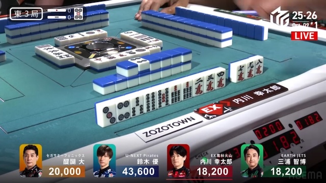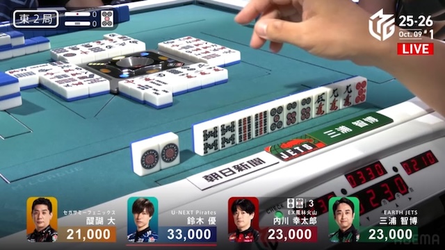 優は【2ピン】【5ピン】【8ピン】待ちでテンパイを入れる。先手の内川、勝負手の醍醐に対しても、わずかの隙を逃さない。