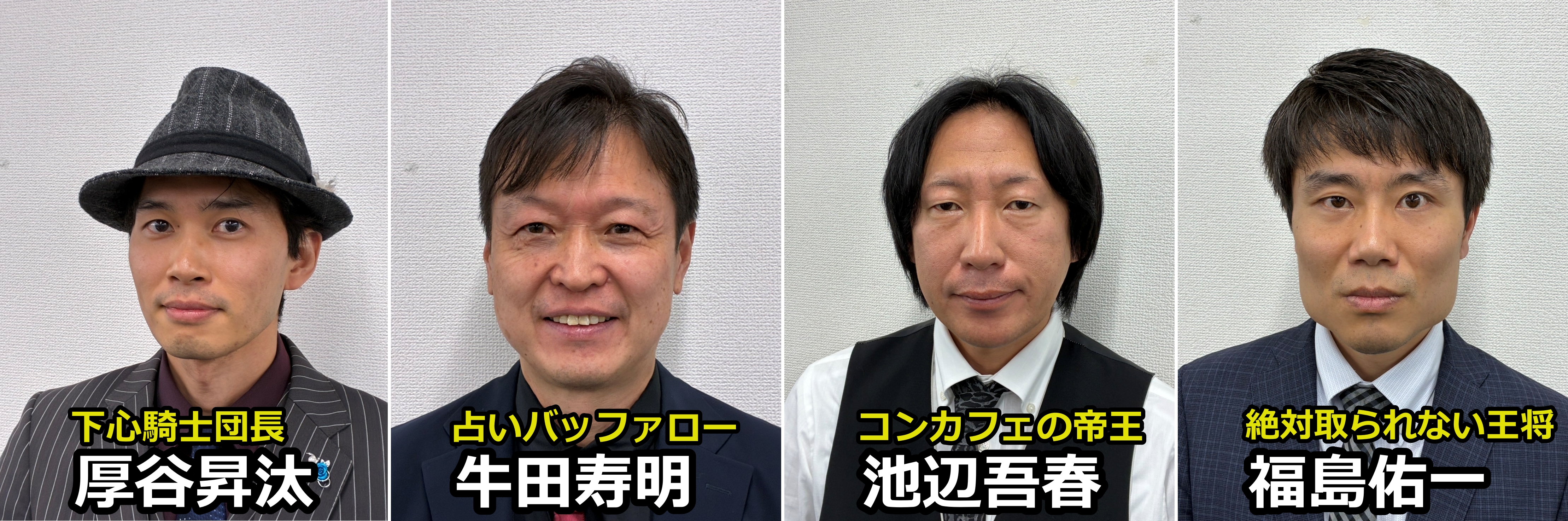 A卓 厚谷昇汰(連盟 下心騎士団長) 牛田寿明(RMU 占いバッファロー) 池辺吾春(連盟 コンカフェの帝王) 福島佑一(連盟 絶対取られない王将)