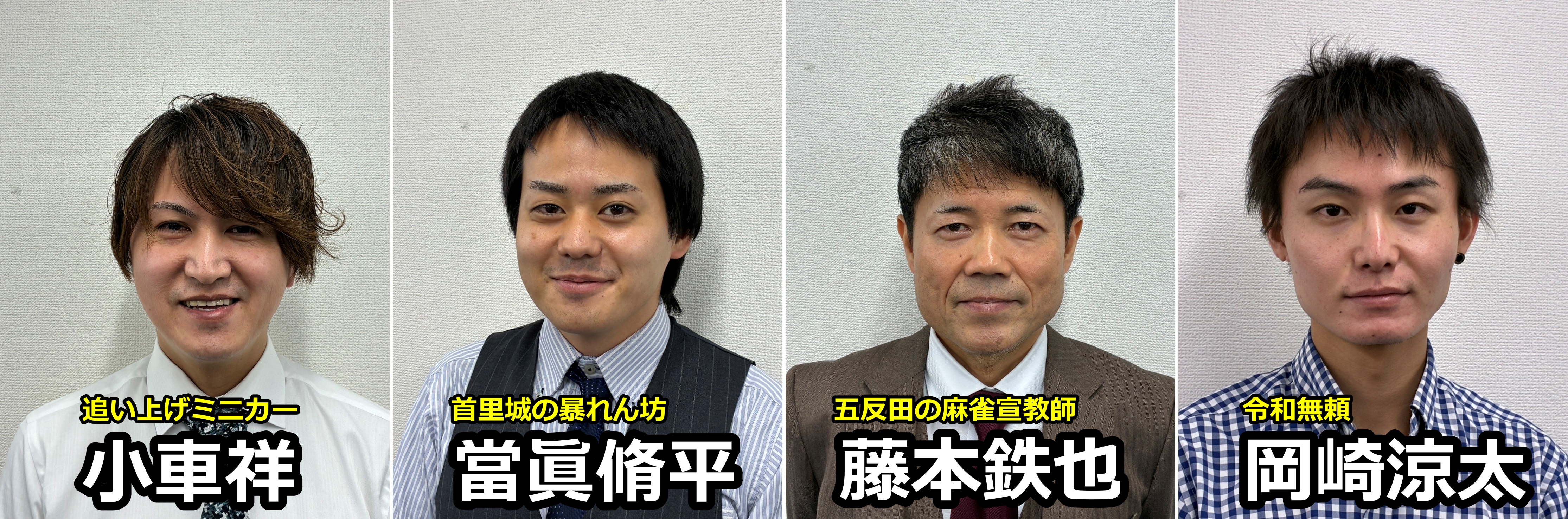 B卓 小車祥(連盟 追い上げミニカー ) 當眞脩平(協会 首里城の暴れん坊) 藤本鉄也(連盟 五反田の麻雀宣教師) 岡崎涼太(連盟 令和無頼)