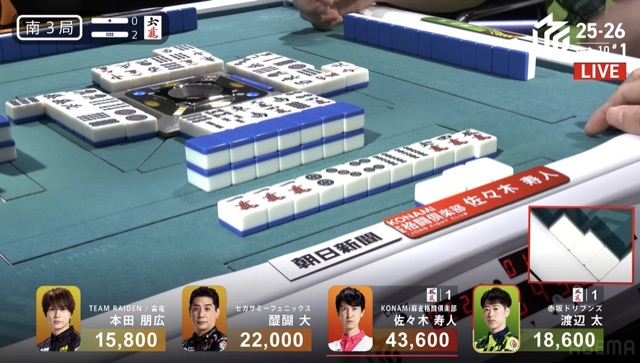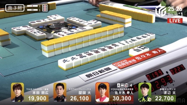 リーチ一発ツモの4,000オールで均衡を破った寿人は、続く2本場でも1,300オールで加点に成功。