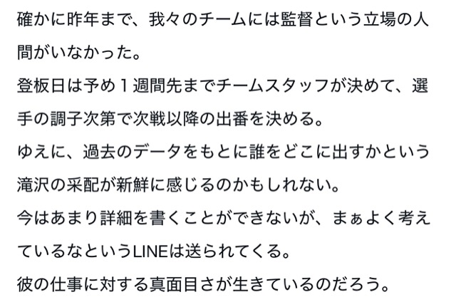 滝沢を思いやる言葉がたくさん散りばめられているのが非常に印象的な文章だった。