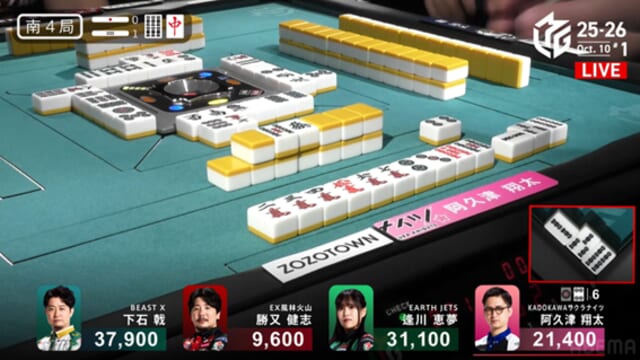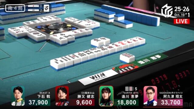南4局2本場では逢川がのリーチを敢行し、安目ながら一発ツモ。裏ドラは乗らず、3着をキープする和了となった。