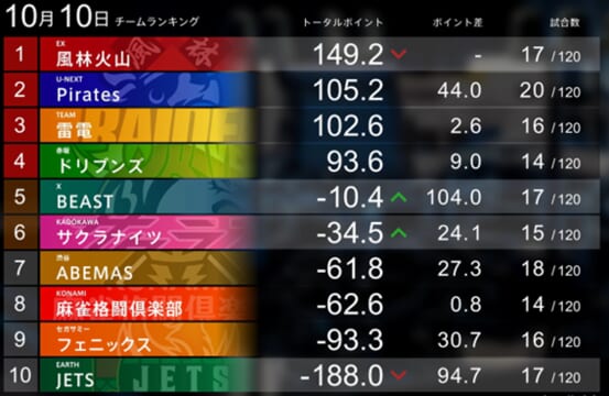 風林火山が首位の座をキープしているとはいえ、最下位のJETSまでの点差もおよそ340ポイントと、上下の点差が縮まってきた印象だ。今季は2卓同時開催もあり、ポイントの移動がかなり激しくなることが予想される。きっと、レギュラーシーズンが佳境を迎える頃には、さらに順位が入れ替わっているだろう。自分の色を前面に出し続けるルーキーたちの台頭もあり、これからの戦いからますます目が離せない。