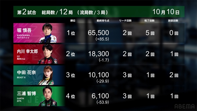 東場から終始主導権を握った堀は和了回数が5、放銃は0回という、パーフェクトな試合運びだった。