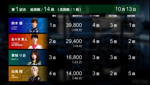 リーチ対決に負けてしまい、トップには届かず終局となるのだった。