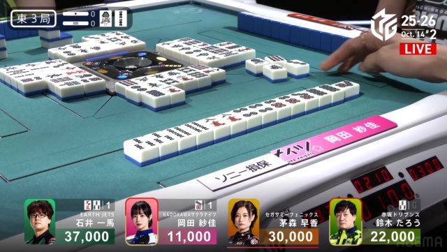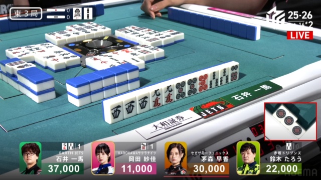 実はたろう自身、少し前にドラでションパイのを打っており、これには声が掛からなかった。既に岡田の手に暗刻だったためだが、その時点でドラすら切らない守備的な打ち手もいるだろう。実際、実況・解説の2人も驚いていた。