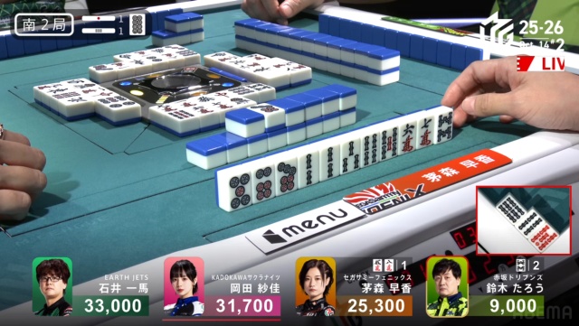まずは岡田紗佳がドラドラ赤の勝負手で先制リーチ。と