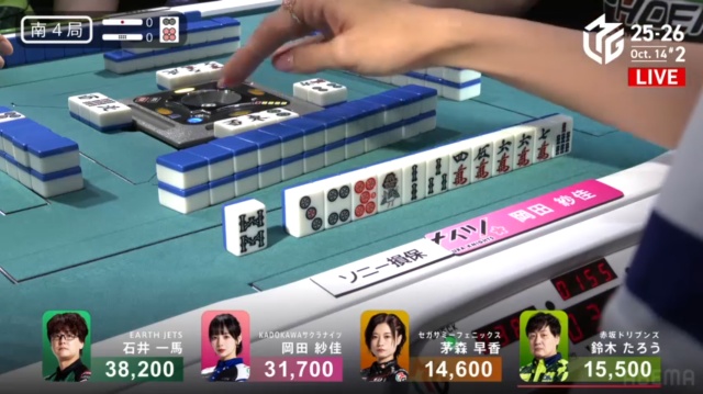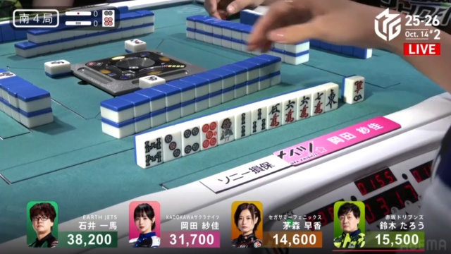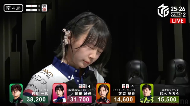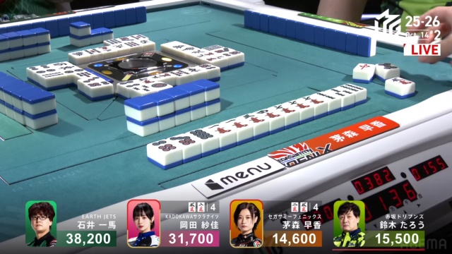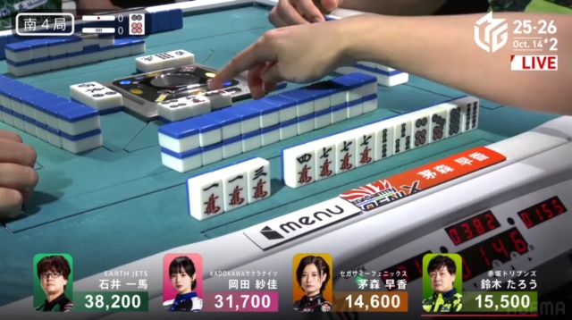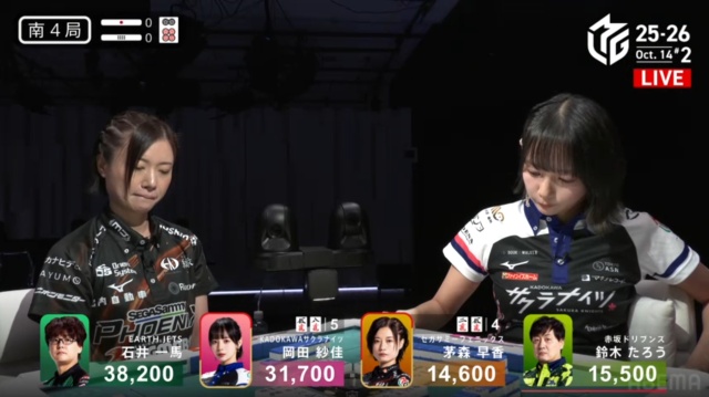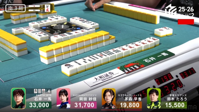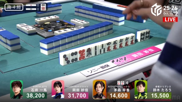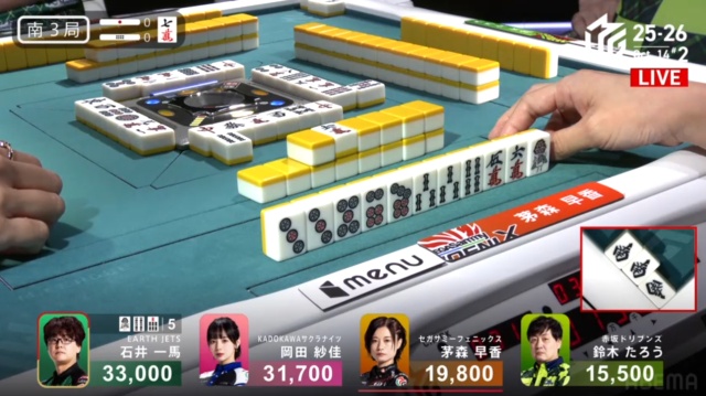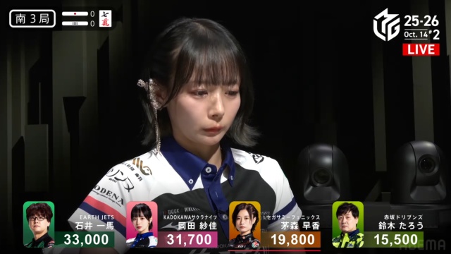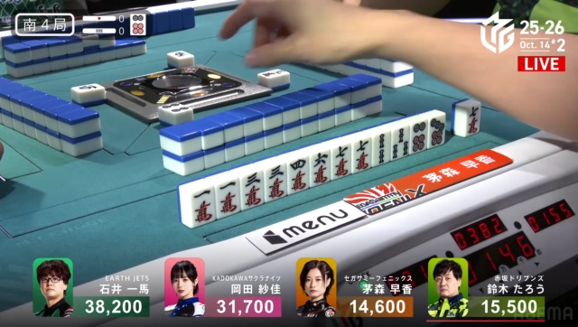 今シーズン、セガサミーフェニックスの新監督に就任した茅森。ディフェンディングチャンピオンとして臨む選手兼任監督の1年目は、ここまで個人3連続ラス。初トップどころか、痛恨の4ラスのピンチを迎えつつ、オーラスへ。