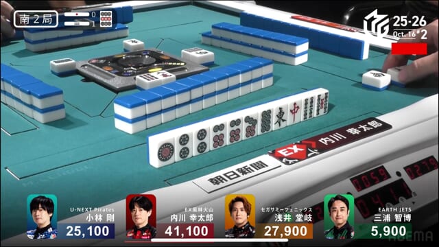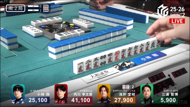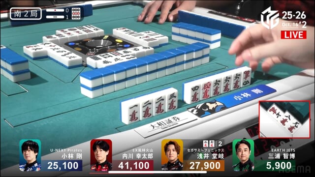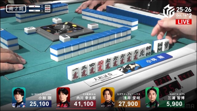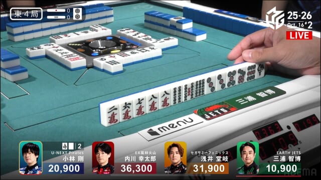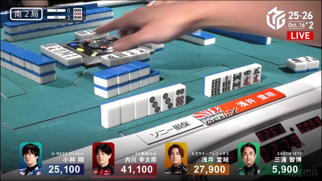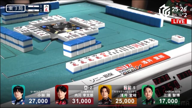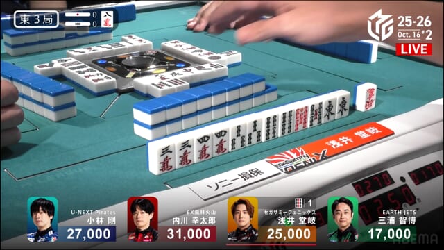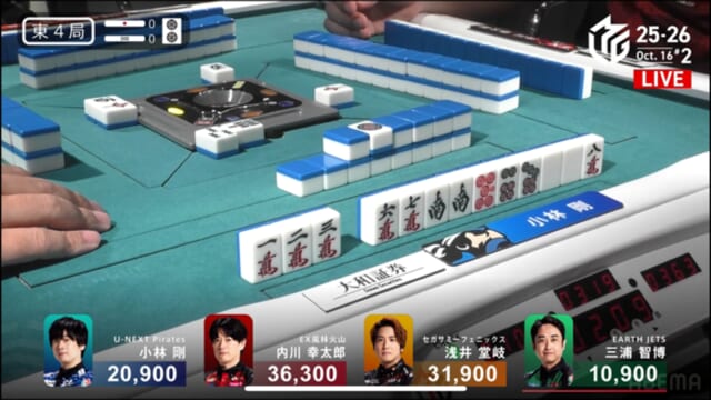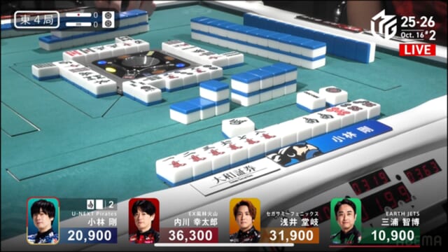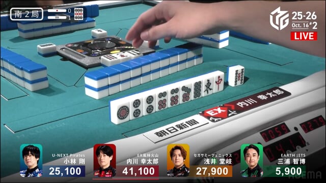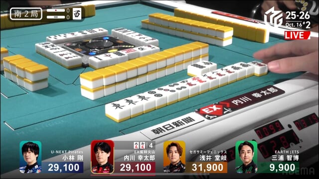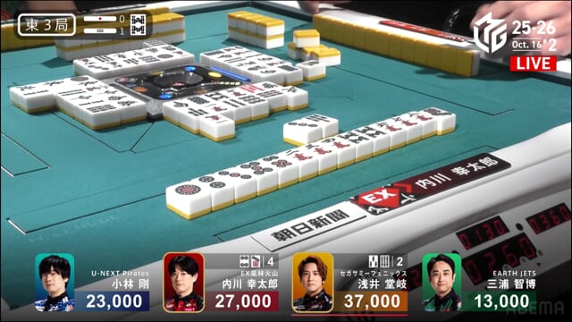 親の内川、リーチ・ツモ・・赤1、4000オールのツモ和了。トップが目まぐるしく変わる中、三つ巴の膠着状態からついに内川が一歩リード!