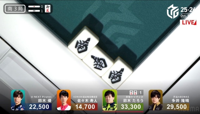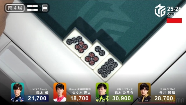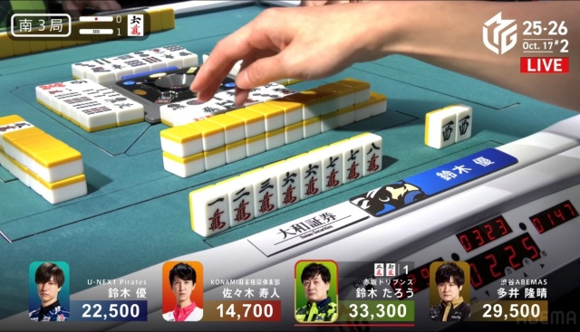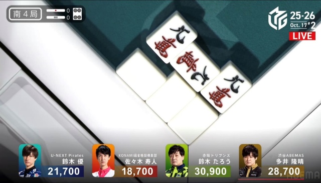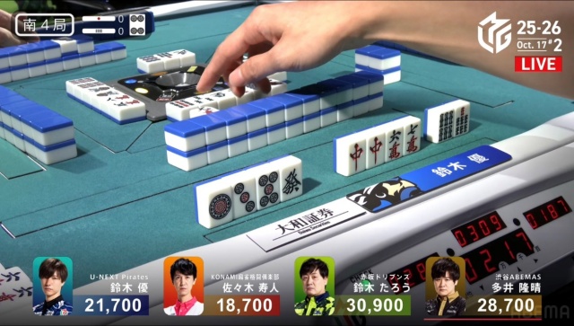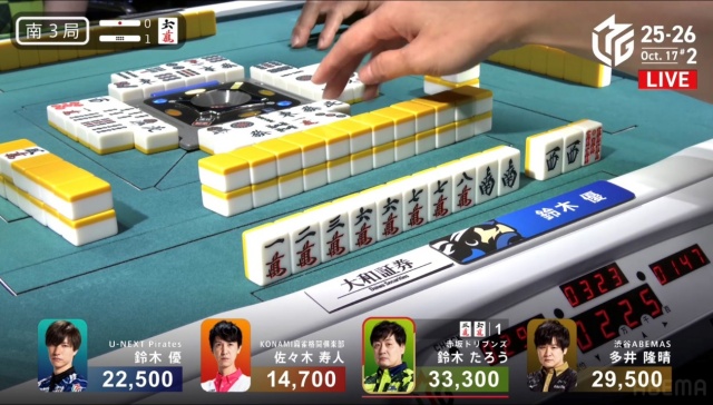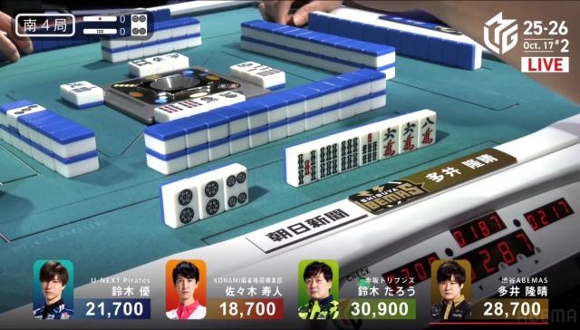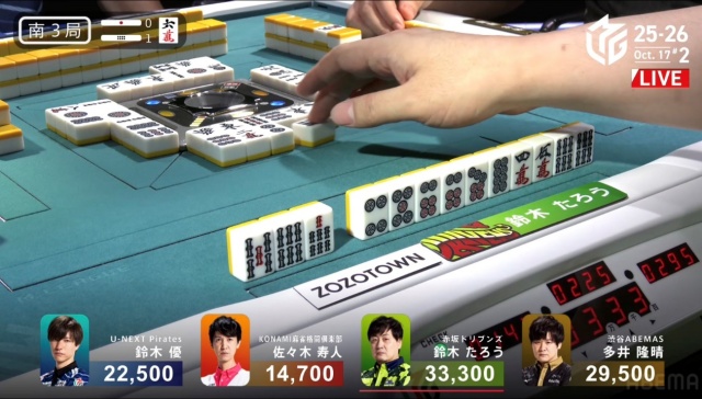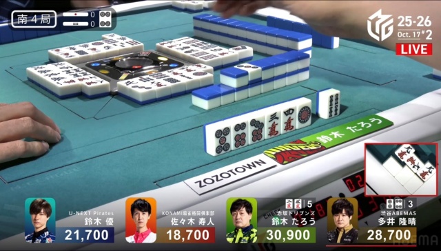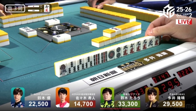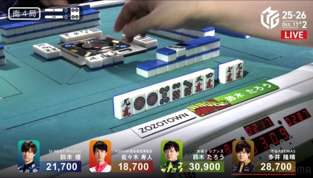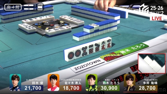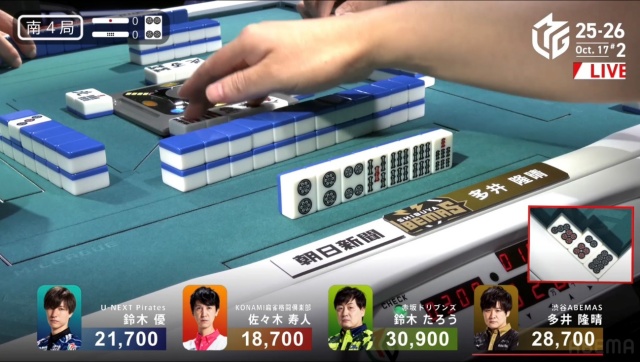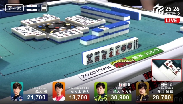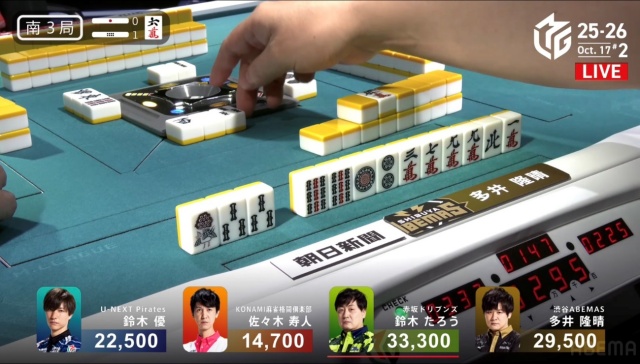 親番のたろうが勝負を決めにいくリーチを放つ。
