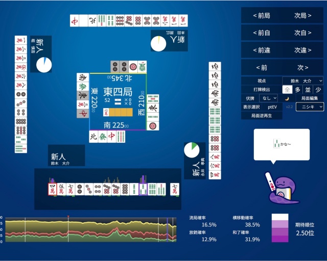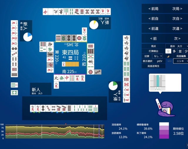 この局は、ドラ2の大介が上家のポン。タンヤオを見据えた一鳴きをすると