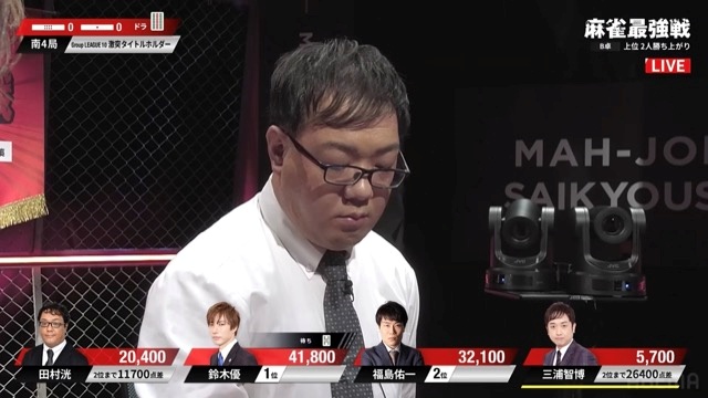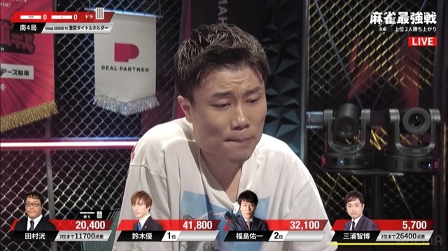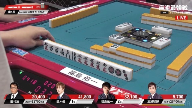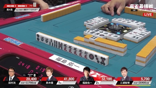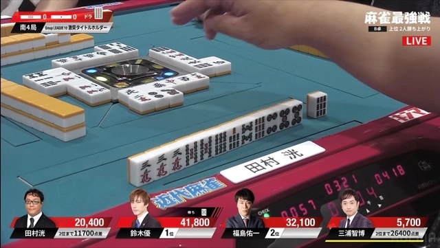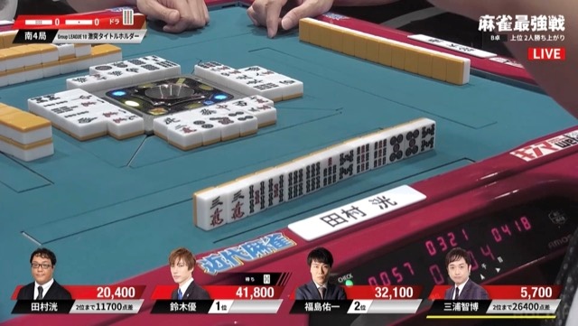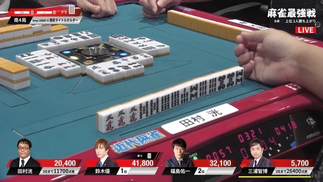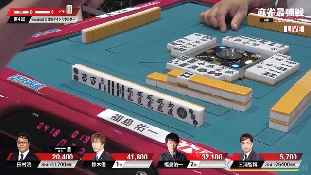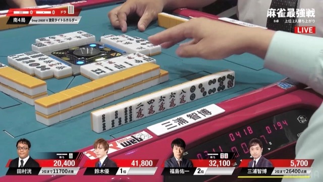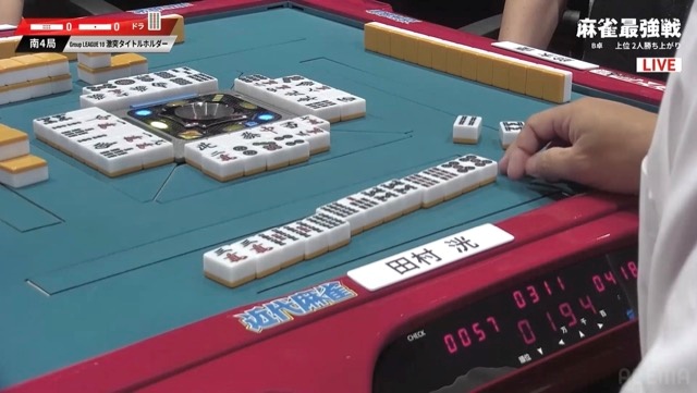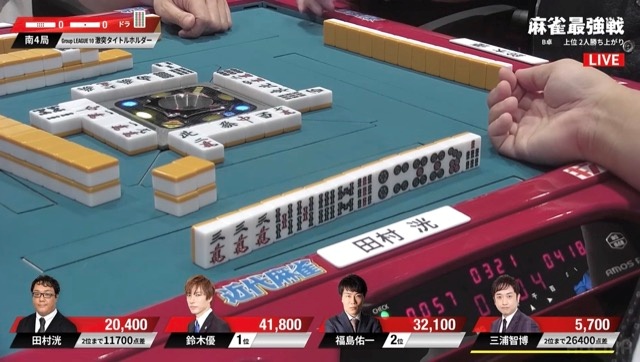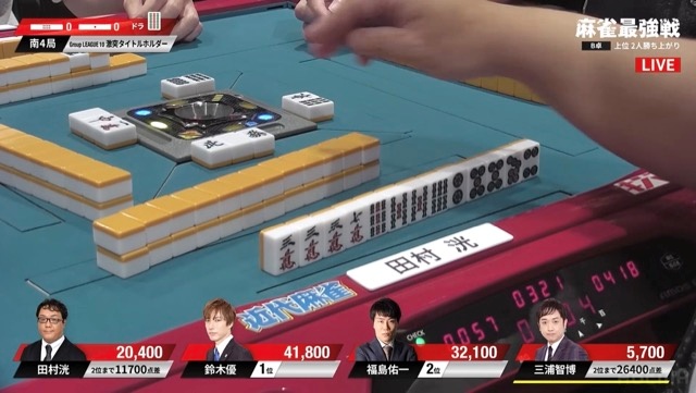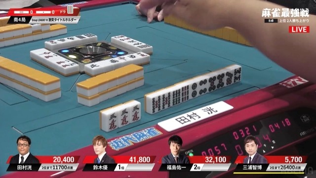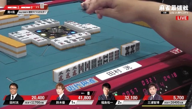 リーチ棒を出すと、田村の条件が緩和され満貫ツモでかわされてしまう。
