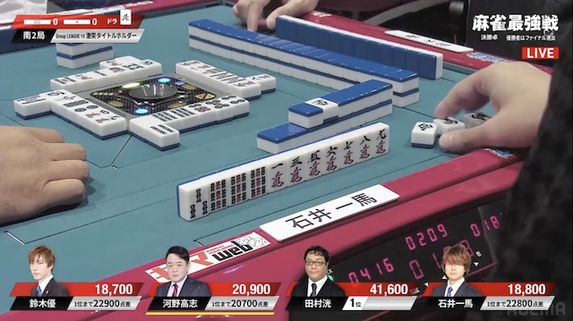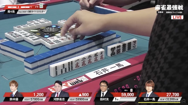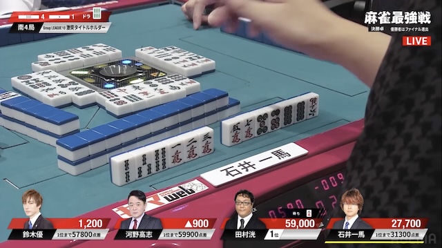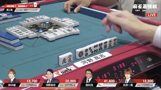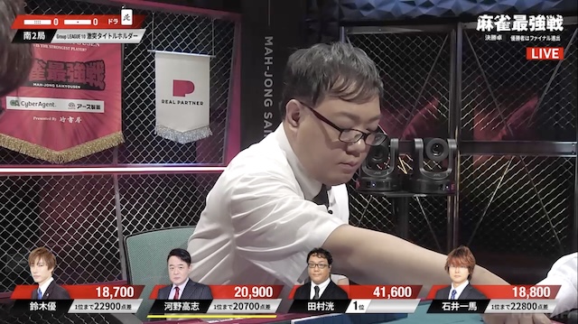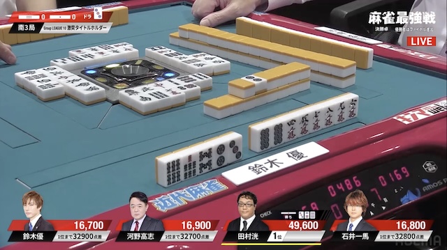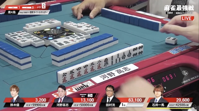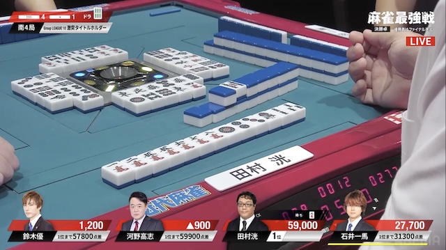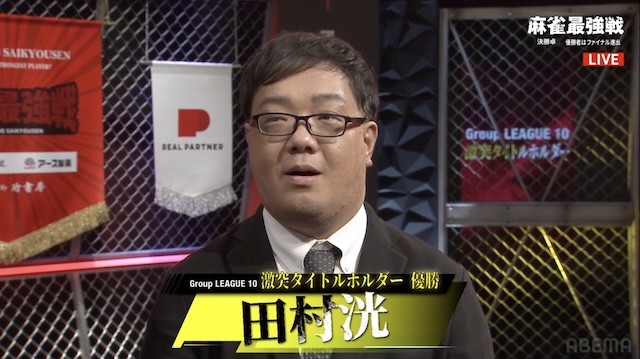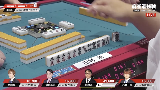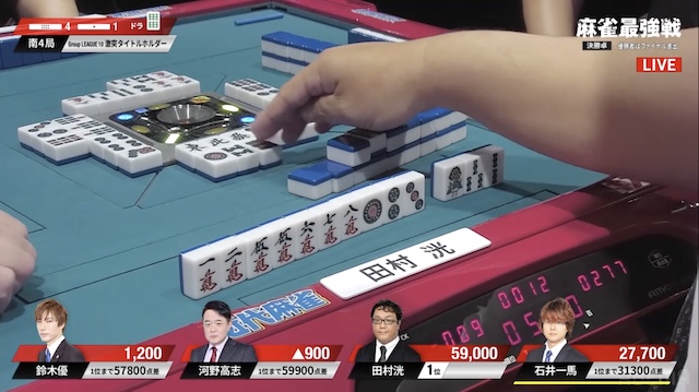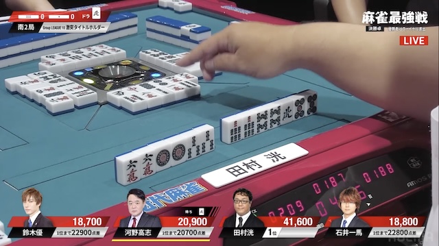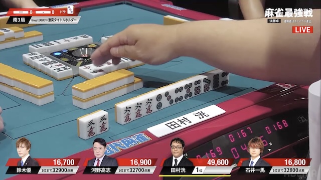 オーラスでは河野が、麻雀最強戦で禁止されている逆転条件のないアガリをしてチョンボを取られる場面もあったが、相手にそれをさせてしまうくらい、決勝卓での田村は圧倒的だった。