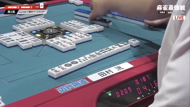 田村もテンパイ。こちらも単騎待ちだ。どちらかが待ちを変えれば相手に放銃となる。