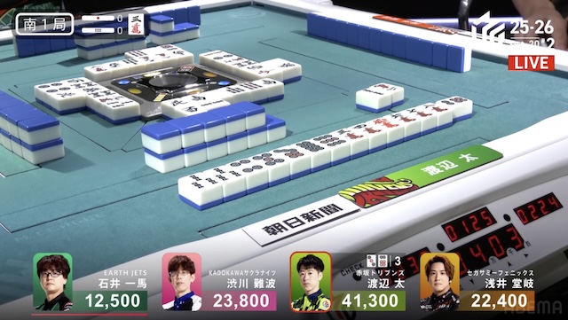 リーチ一発タンヤオイーペーコー赤、12000は12300。渋川、2局連続の満貫。