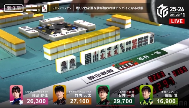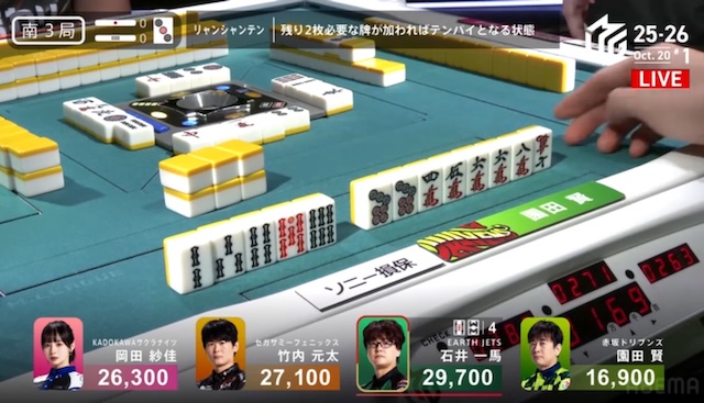全員が7巡目にしてイーシャンテンにたどり着く中、最初のテンパイを入れたのが一馬だった。