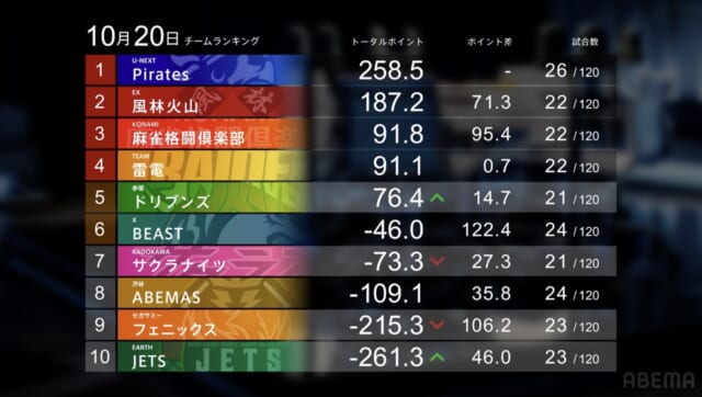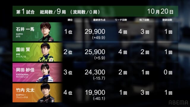 一馬のアガリとなって、見事一馬が第1試合のトップを獲得するのだった。
