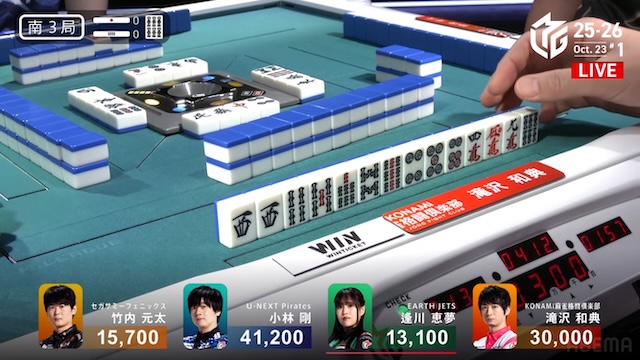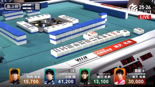 トップ目・小林が41,200点。追いかける滝沢は30,000点持ち。