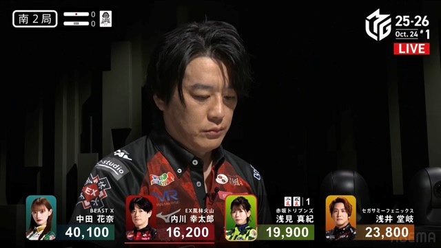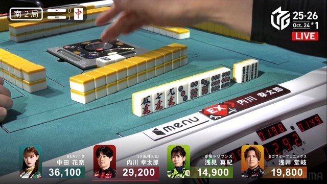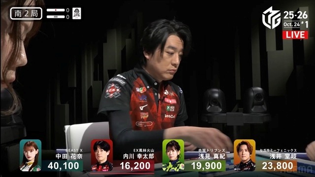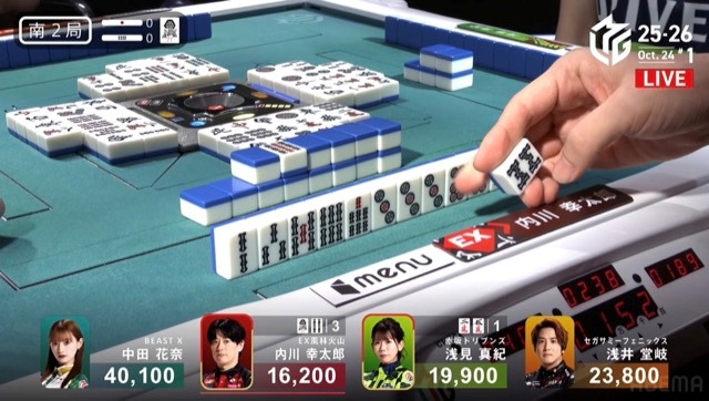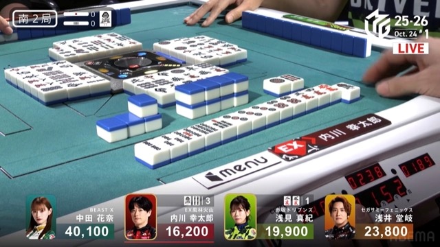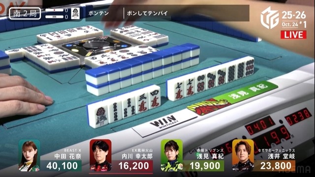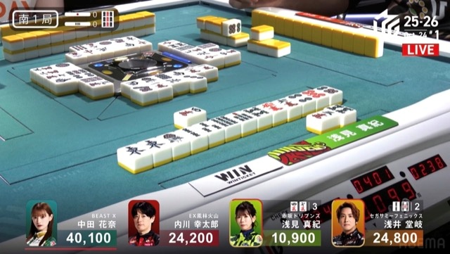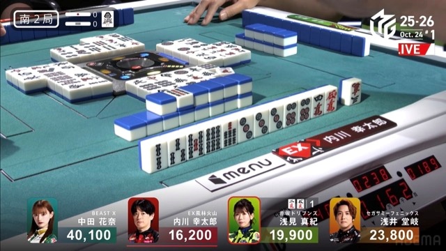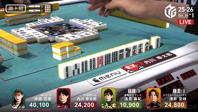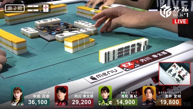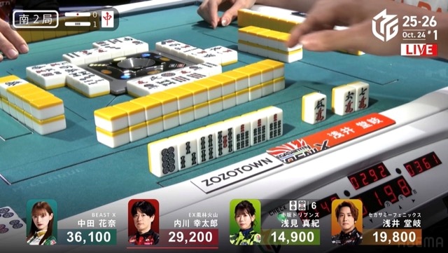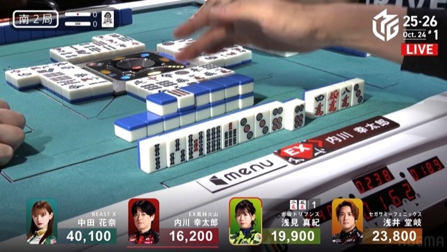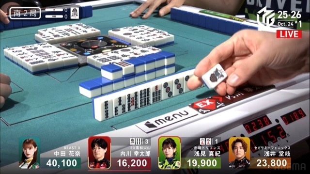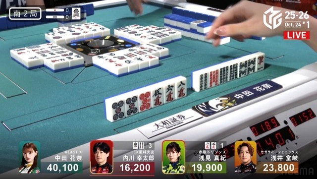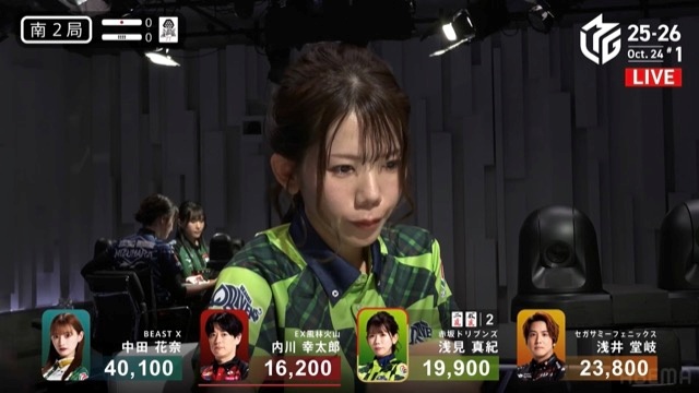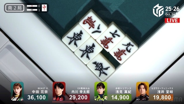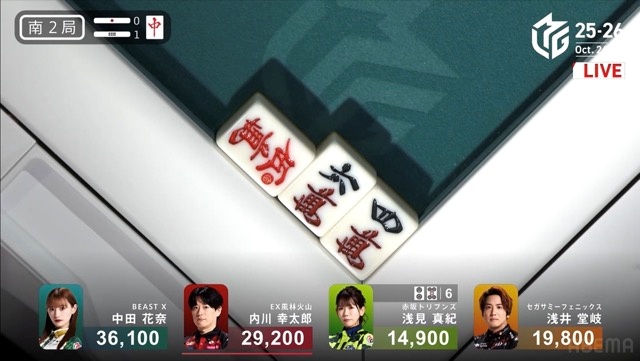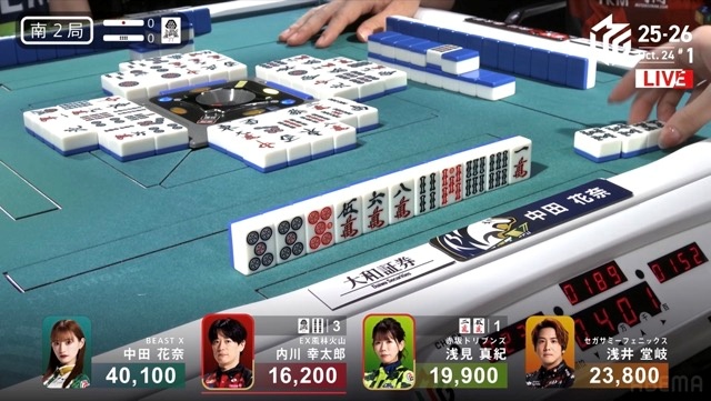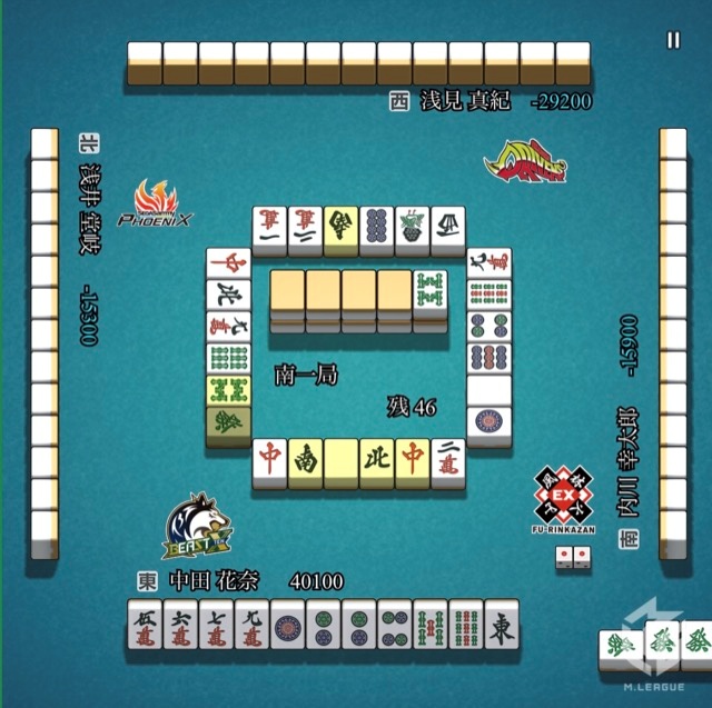 リーチツモ海底ドラ赤の4,000オールとして中田は点差を詰められる結果に。