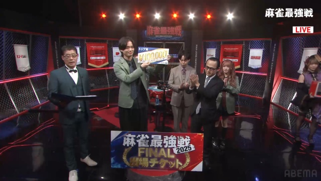 多喜田プロには麻雀最強戦2025ファイナルへの出場権、賞金10万円ならびにアース製薬商品の詰め合わせが贈られた。