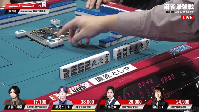 平良の先制リーチを受け、親番の鷹見。一発目に無筋の