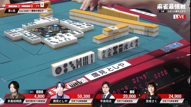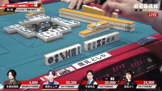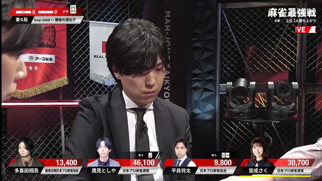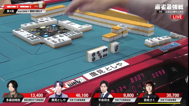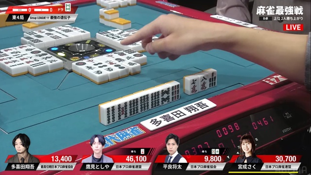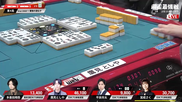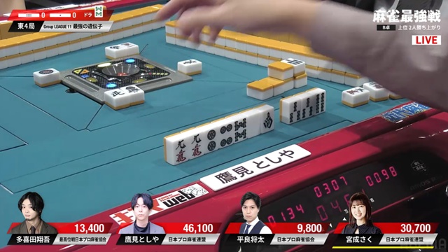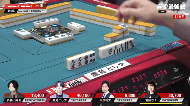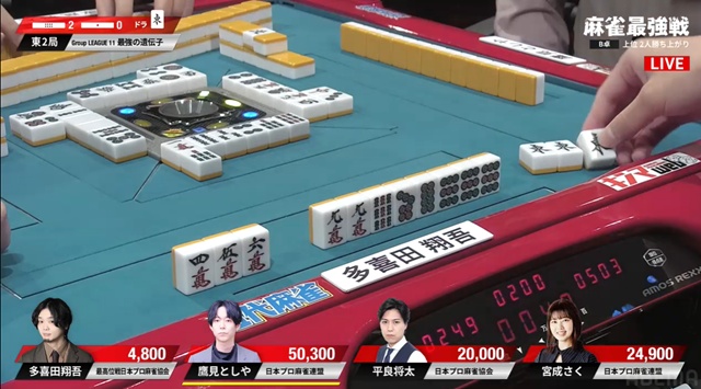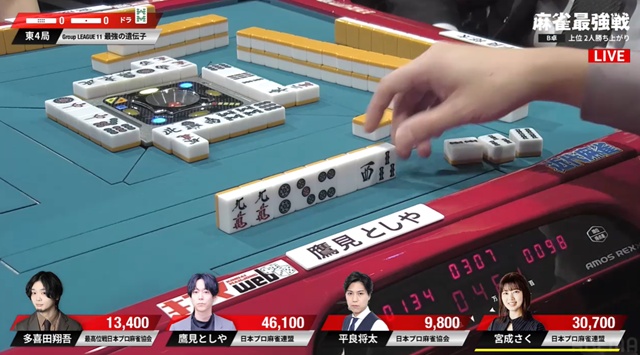 着順が上の選手と点差を縮められるような大きい手をアガりたい。多喜田は鷹見の上家であるが、自分の手が良ければ下家である鷹見を無視してでも進める。