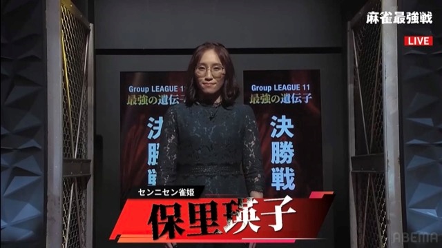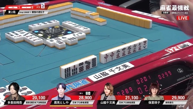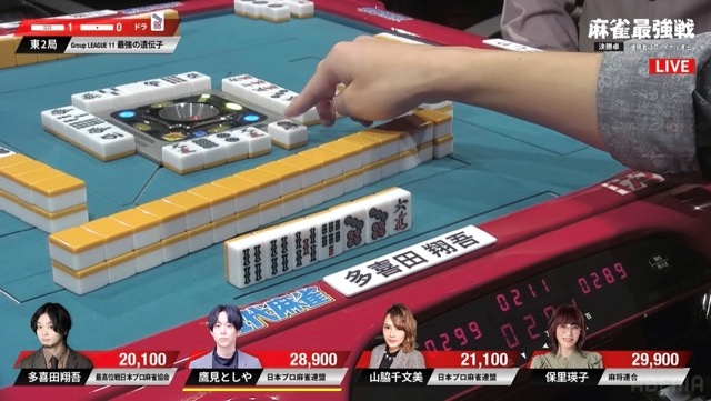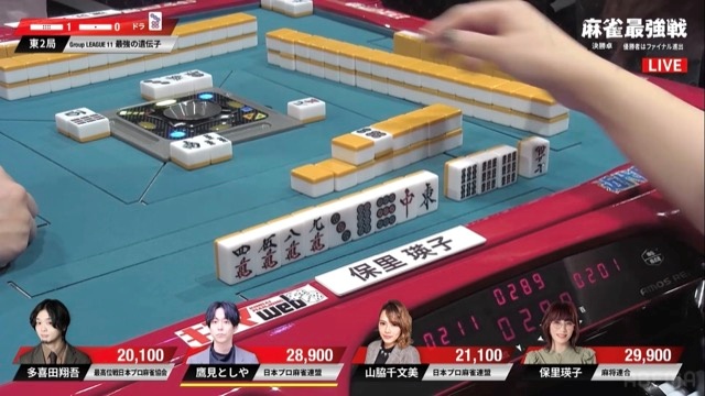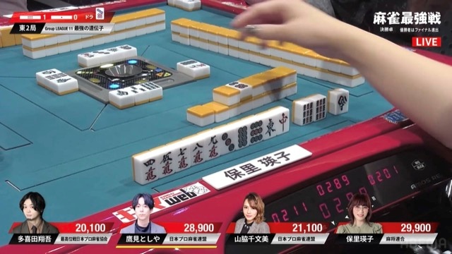終盤、保里が執念で追いついてテンパイ、リーチで鷹見に弓を引く。