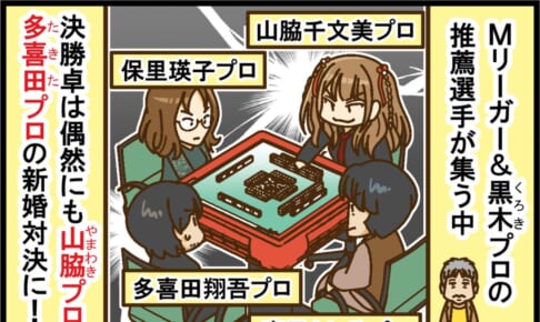 多喜田翔吾・山脇千文美、 両プロが決勝戦で新婚対決! 【Mリーグほぼ毎日4コマ】 2025年10月25日 作・藤島じゅん/VOL.975 麻雀最強戦2025 最強の遺伝子